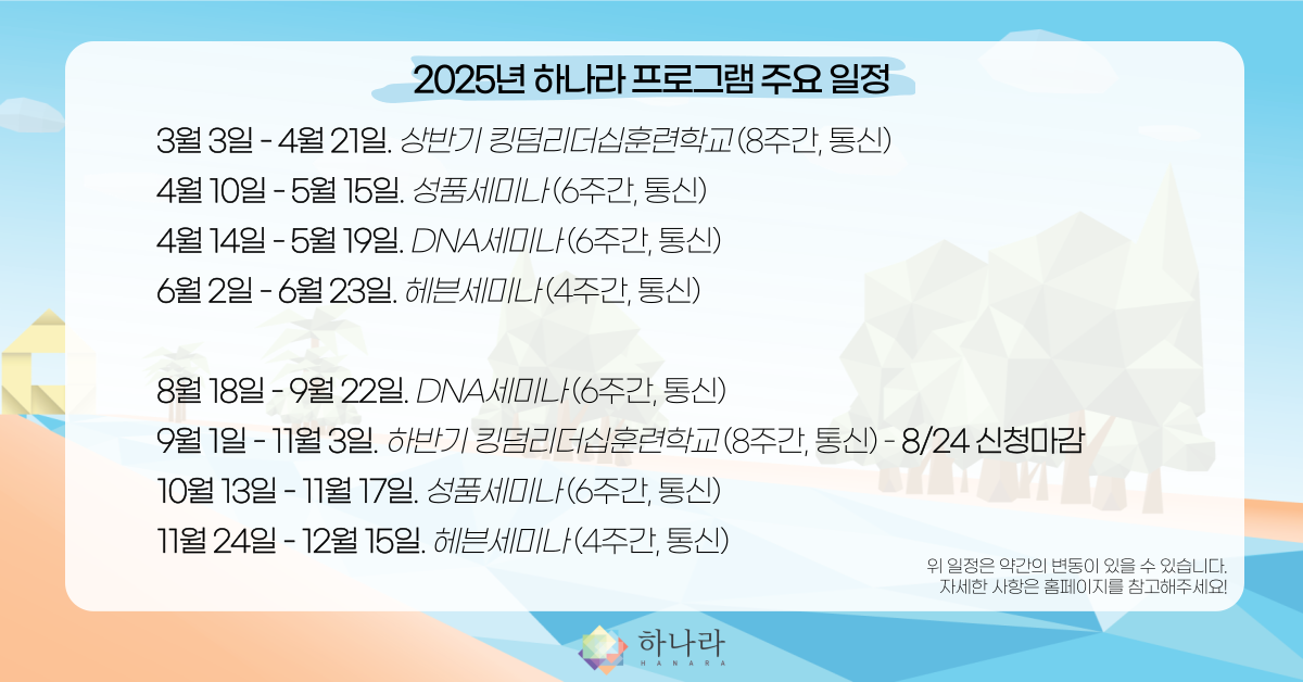 하나님이 말씀하시는 것들에 가볍게 순종함으로 한 걸음 한 걸음 걸어오던 중, 2024년 7월 하나라 간사로 함께하게 되었습니다.